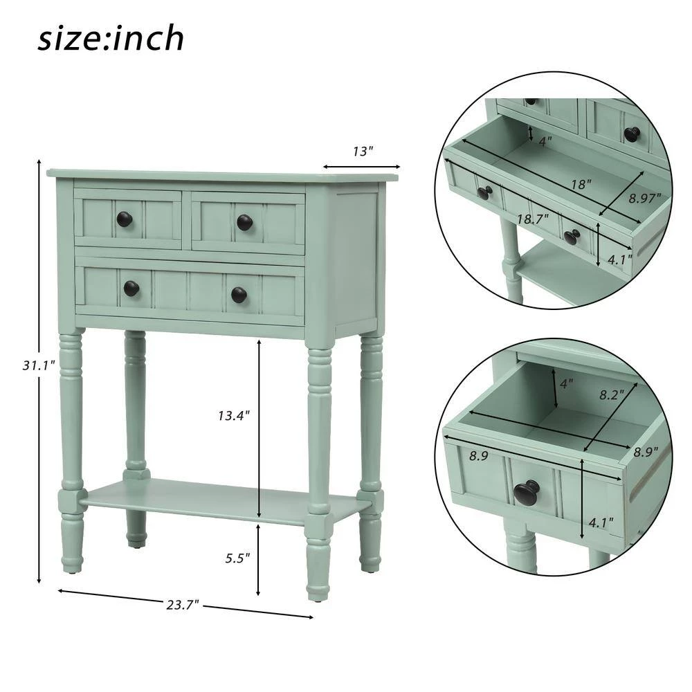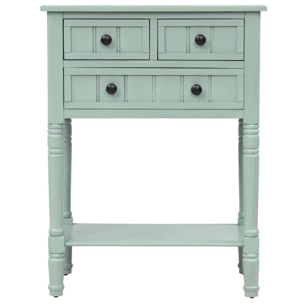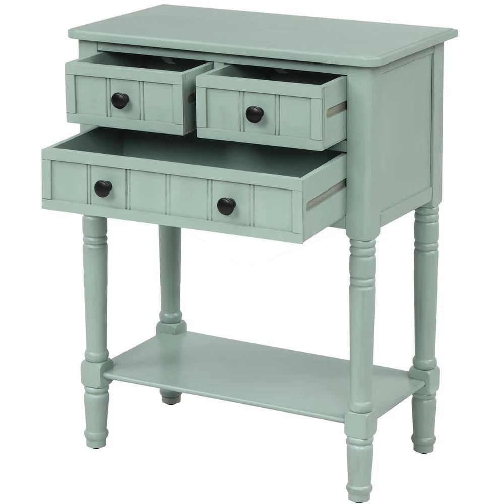 Bring a cottage-chic style to your space with this small console table. Crafted of a solid and manufactured wood in a handsome finish, this console table features simple moldings beadboard panel details, metal ring hardware, and turned post legs. Three drawers offer plenty of storage space for smaller accessories, while an open lower shelf is great for stacking books or clustering collected curios.