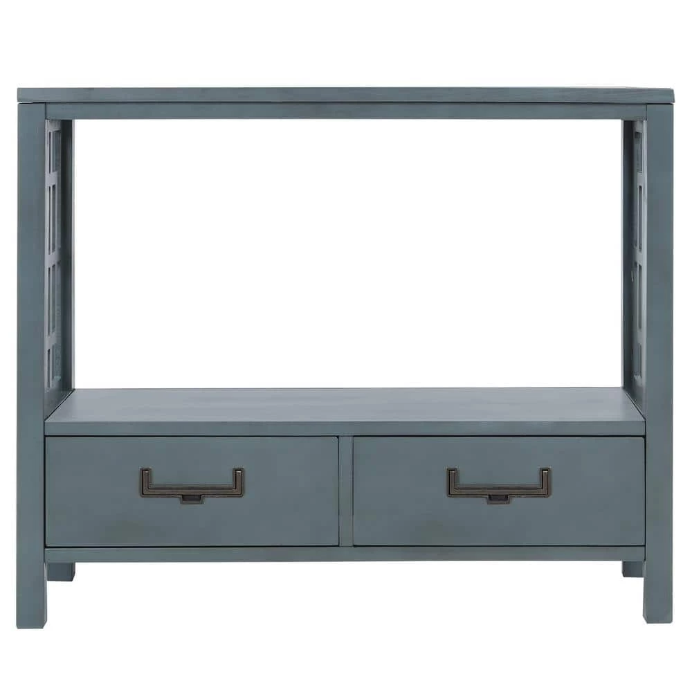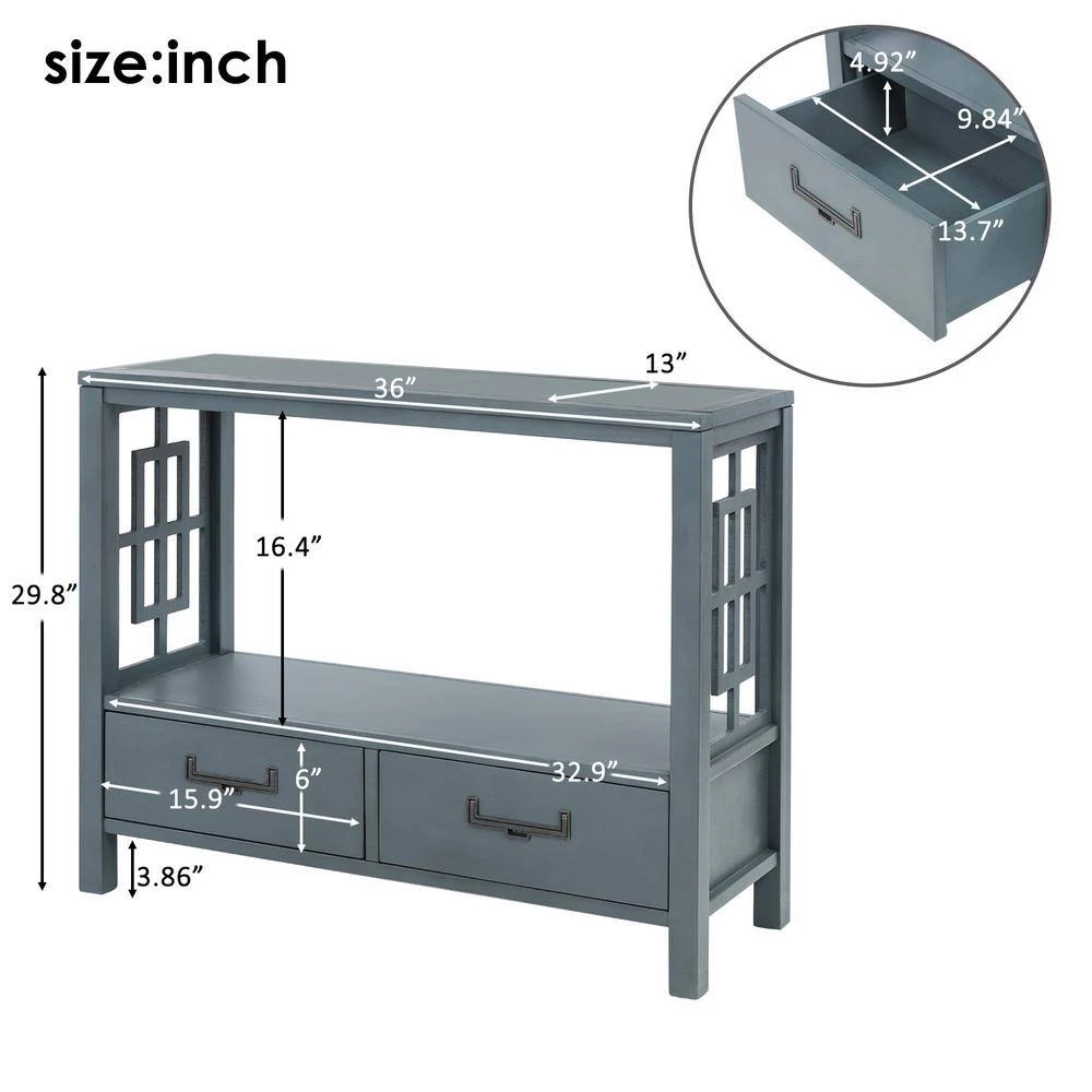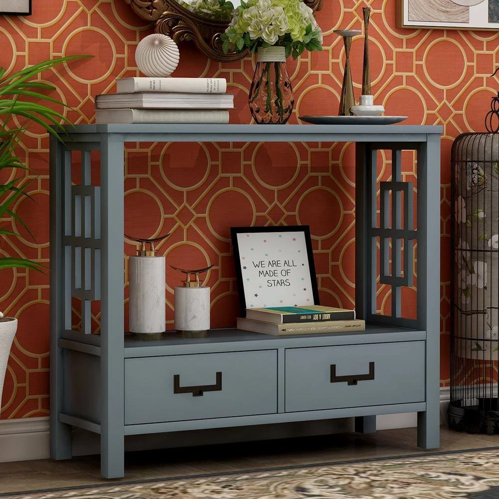 Add a dash of modern farmhouse style to your entryway or living room with this console table. Crafted from solid and manufactured wood, it showcases oriental-inspired trending side cut-out design for eye-catching. As functional as it is charming, this piece features two drawers and a shelf that provide plenty of space to stage framed photos, potted plants, books, and more.