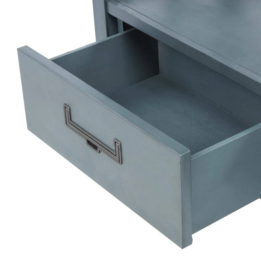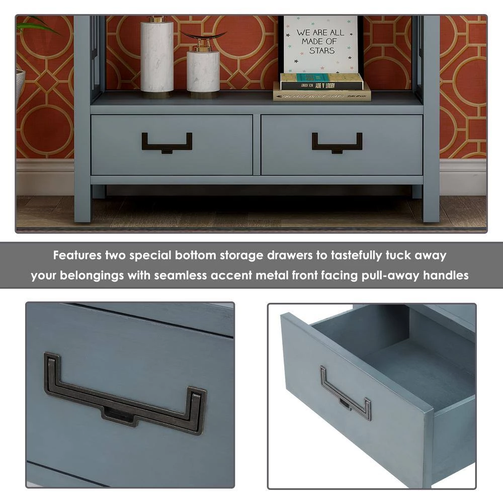- Features 2-special bottom storage drawers to tastefully tuck away your belongings with seamless accent distressed metal front facing pull-away handles