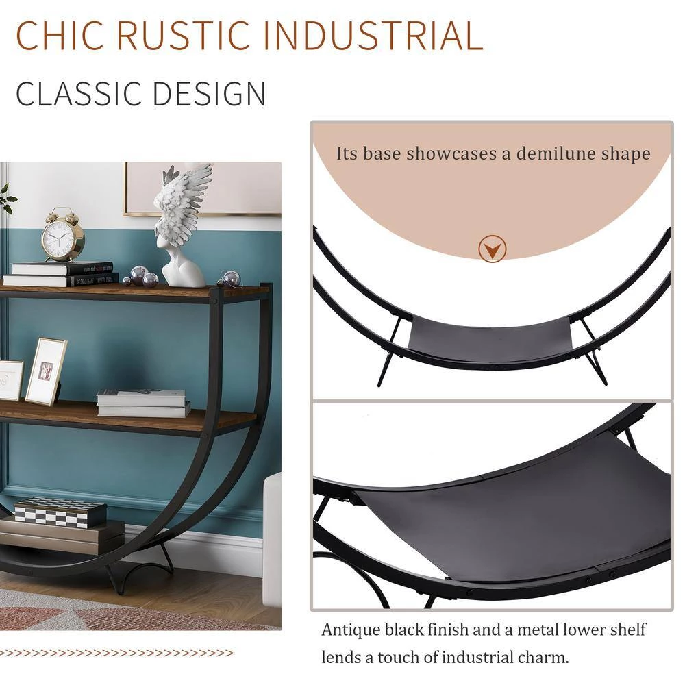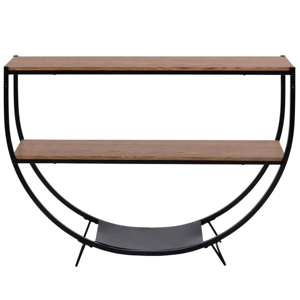 Add a sophisticated industrial look with this console table to your living space. It features 2 tiers of wood grain finished shelving, giving you the space to display your favorite decorative pieces or reading materials. The powder-coated metal frame sports a unique demilune-shaped base, and two sturdy support feet to hold a weight capacity of 200 lbs. Whether outfitting your hallway,entryway, or sprucing-up to your living quarters, this console table will add charm to any ensemble.