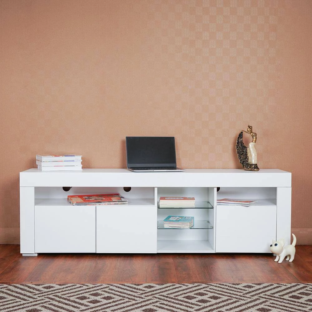 - The High gloss TV cabinet is crafted of high-grade (E1) particle board and tempered glass.