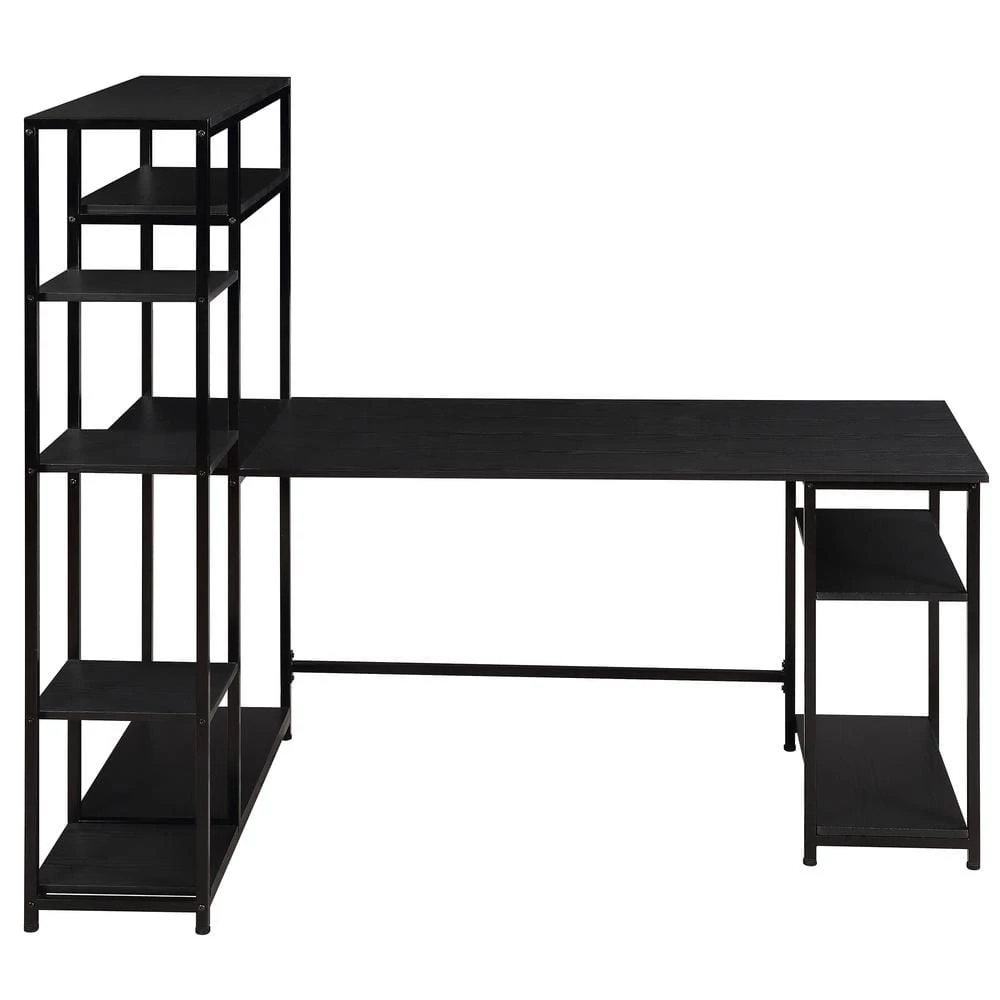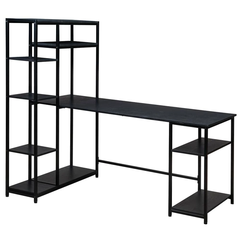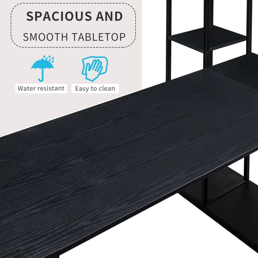 This desk has a spacious desktop and ample storage shelves.The large full-size workstation provide ample storage to lay your books, papers, documents, laptop on the spacious tabletop. And you can put some books, plants or printer on the shelves. It can totally maximize the daily working and reading enjoyment.