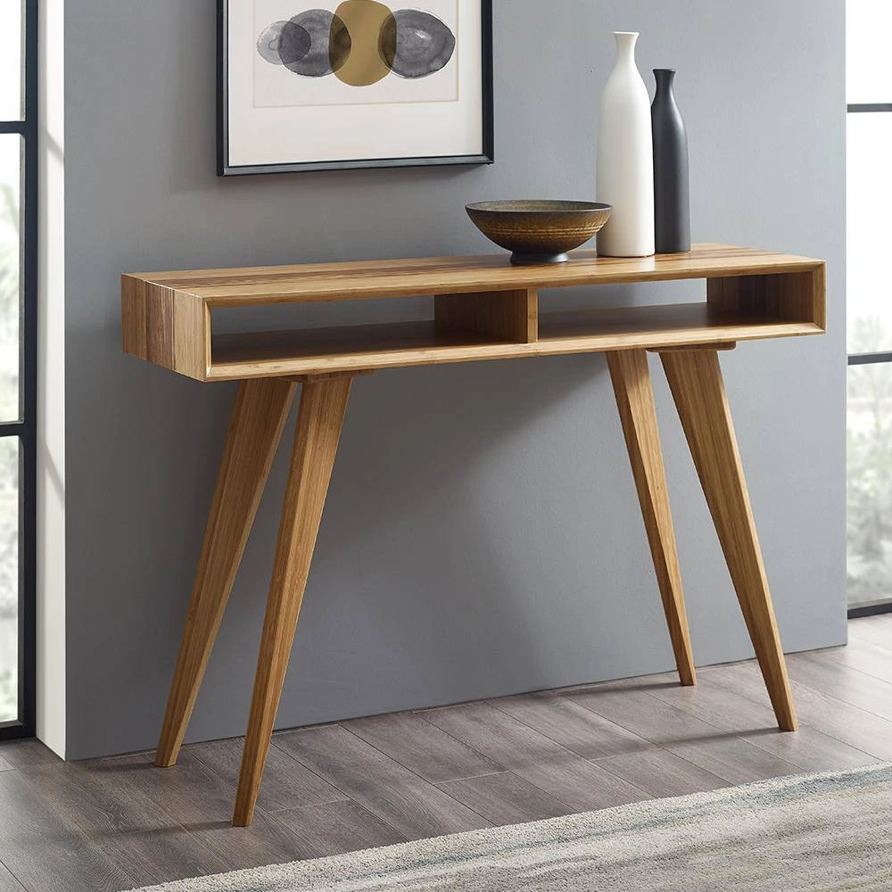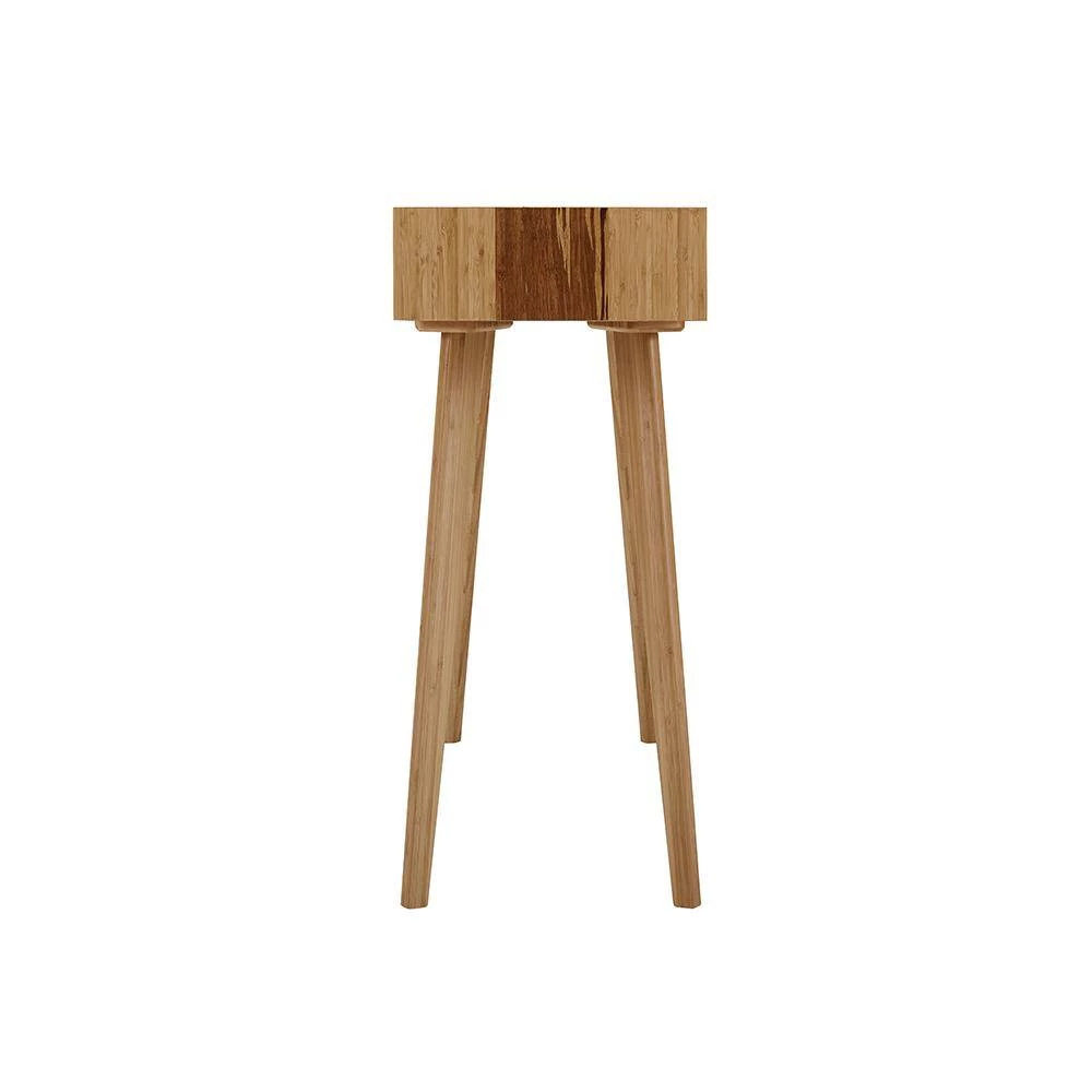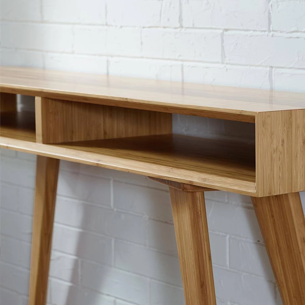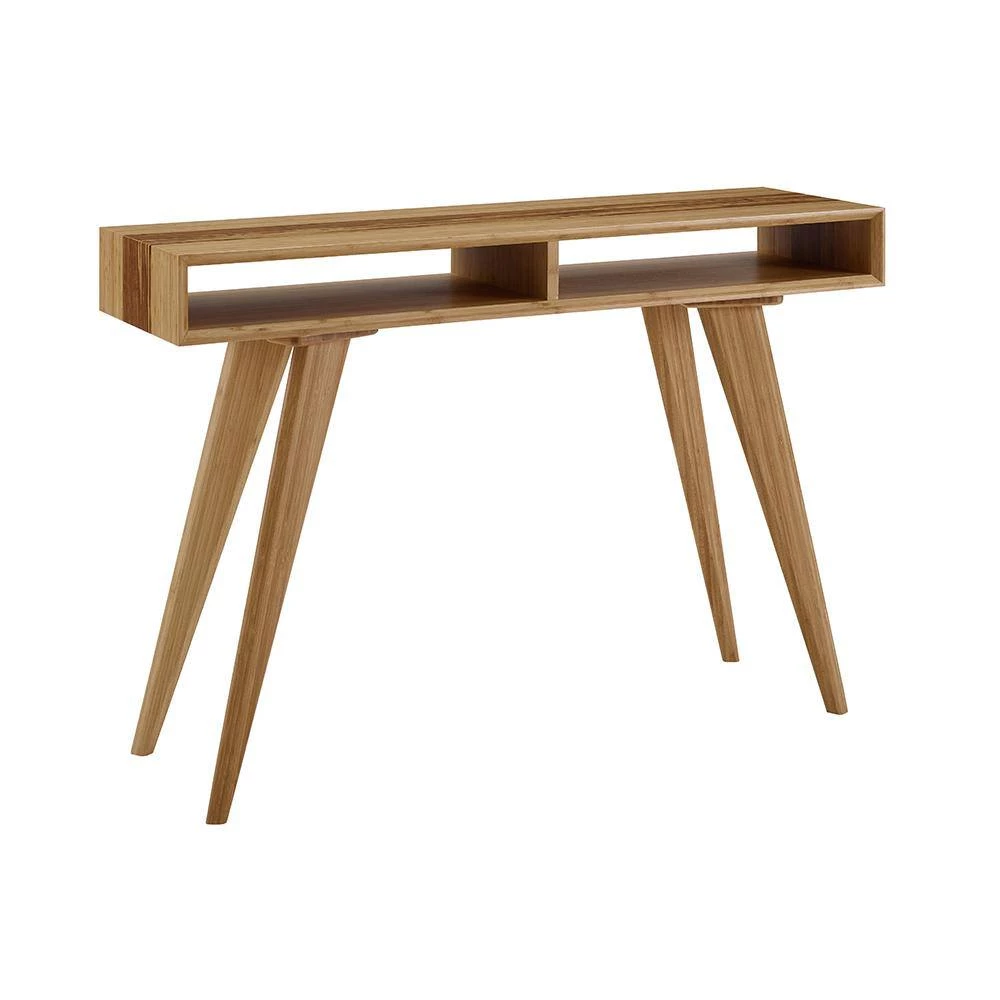 Expertly crafted in earth friendly solid bamboo, Greenington’s modern Azara console table highlights a center accent of exotic Tiger bamboo which waterfall down the sides. Beautifully beveled edges surround clever built in cubbies to stash your mail, keys and any items you want to keep handy. Shown in caramelized with accents in exotic Tiger bamboo. No stain is used, the colors are achieved with heat and pressure. Exotic Tiger combines the light and dark material, creating a unique and beautifully striped grain with continuous colors throughout. No 2-pieces are exactly alike. Variation in grain and color enrich the natural beauty of bamboo furniture and make each piece unique. Slight differences in bamboo shade colors are signs that the furniture has been crafted from solid bamboo and is considered a benchmark of quality.