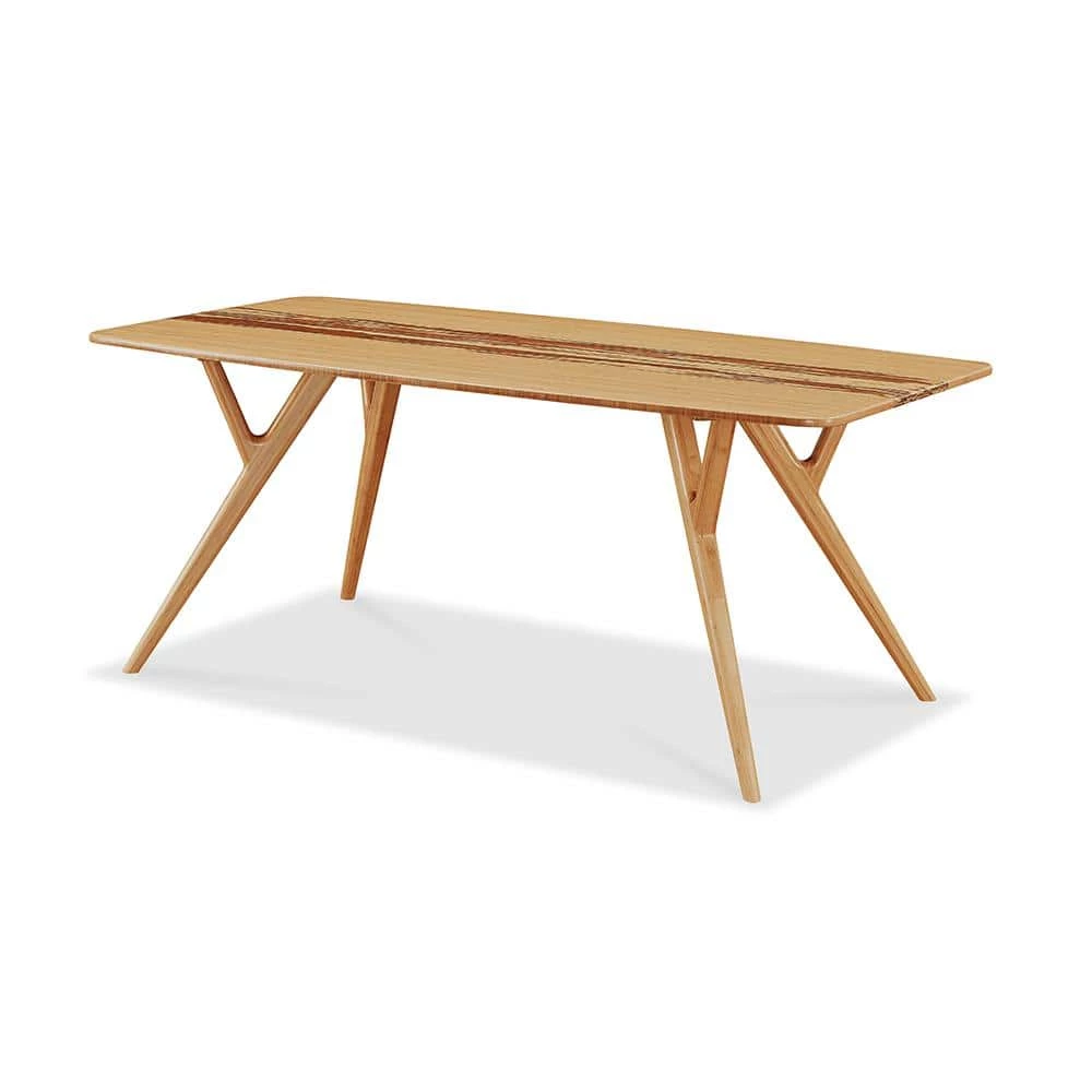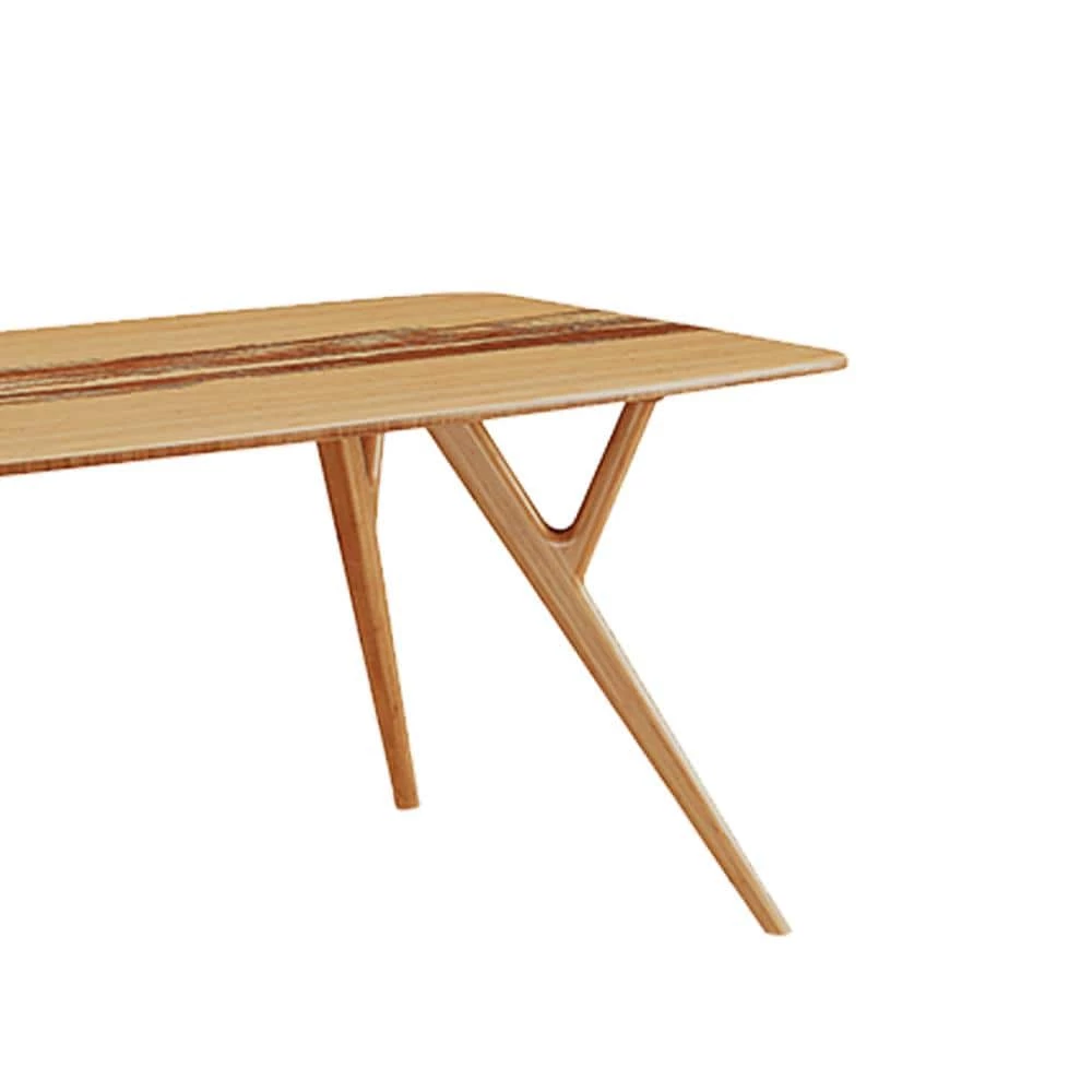 Expertly crafted in earth-friendly solid bamboo, the Ella dining table features a sleek mid-century design with modern architectural lines, great legs and a center table top accent of exotic tiger bamboo. Shown in caramelized with accents in exotic Tiger bamboo No stain is used, the colors are achieved with heat and pressure. Exotic Tiger combines the light and dark material, creating a unique and beautifully striped grain with continuous colors throughout. No 2-Pieces are exactly alike.