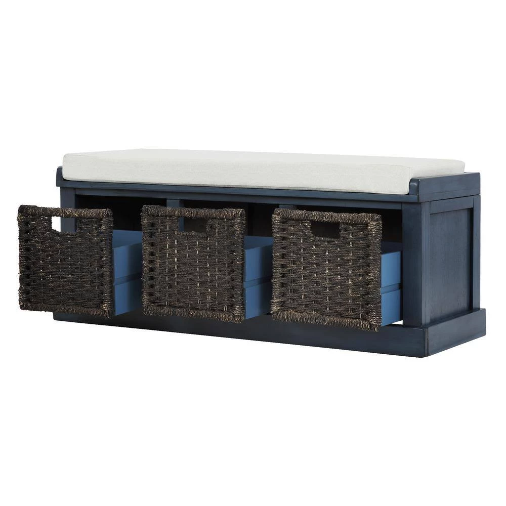 Sit back and relax. This charming storage bench with pine wood frame and upholstered seat is perfect for changing shoes in an entry hall, and its woven baskets can hold towels and other necessities in a master bath. A versatile piece in any room.