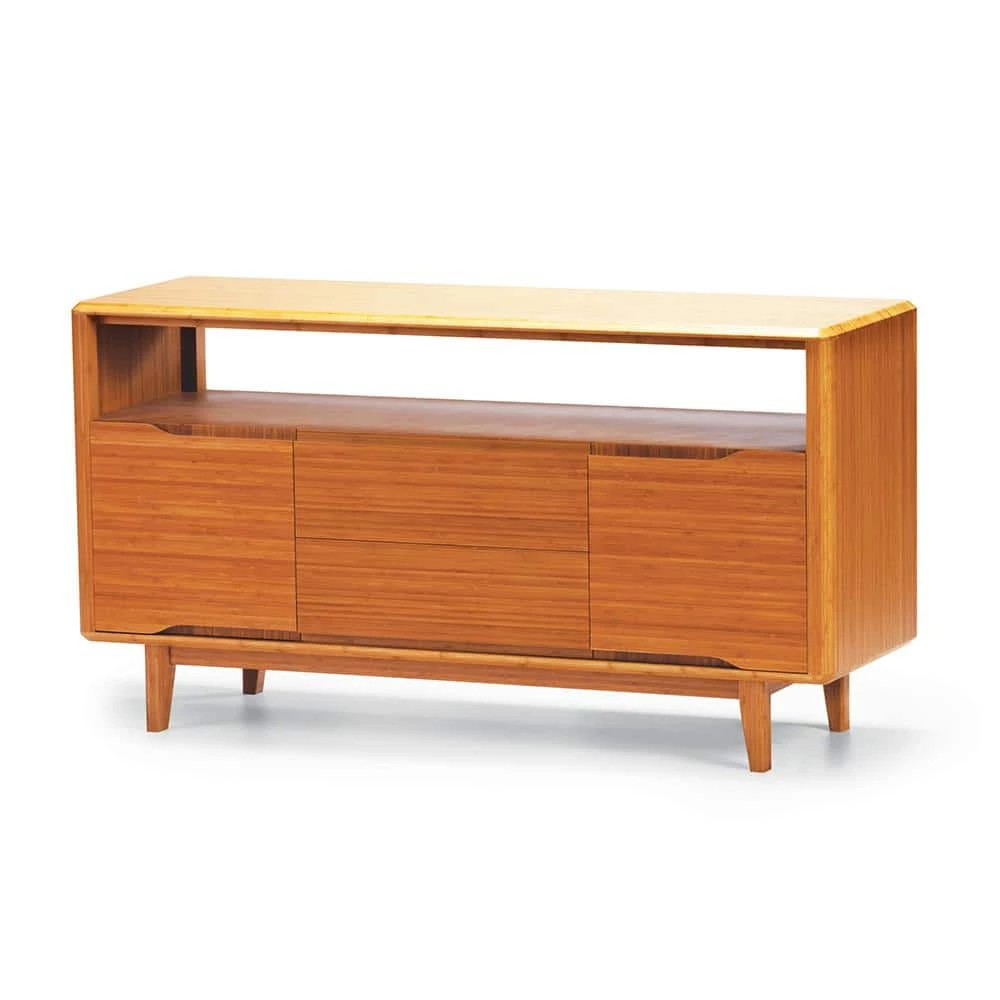 The Currant media cabinet is finished on all four sides and is perfect for all of your electronic media, used as a dining room sideboard, or a contemporary office credenza. Features include an open shelf for media equipment, soft closing drawer glides, cord management, and adjustable shelves behind closed doors. This beautiful cabinet measures 54″ long x 18″ deep x 29″ high, and is available in your choice of caramelized or rich black walnut finish. Ships fully assembled.