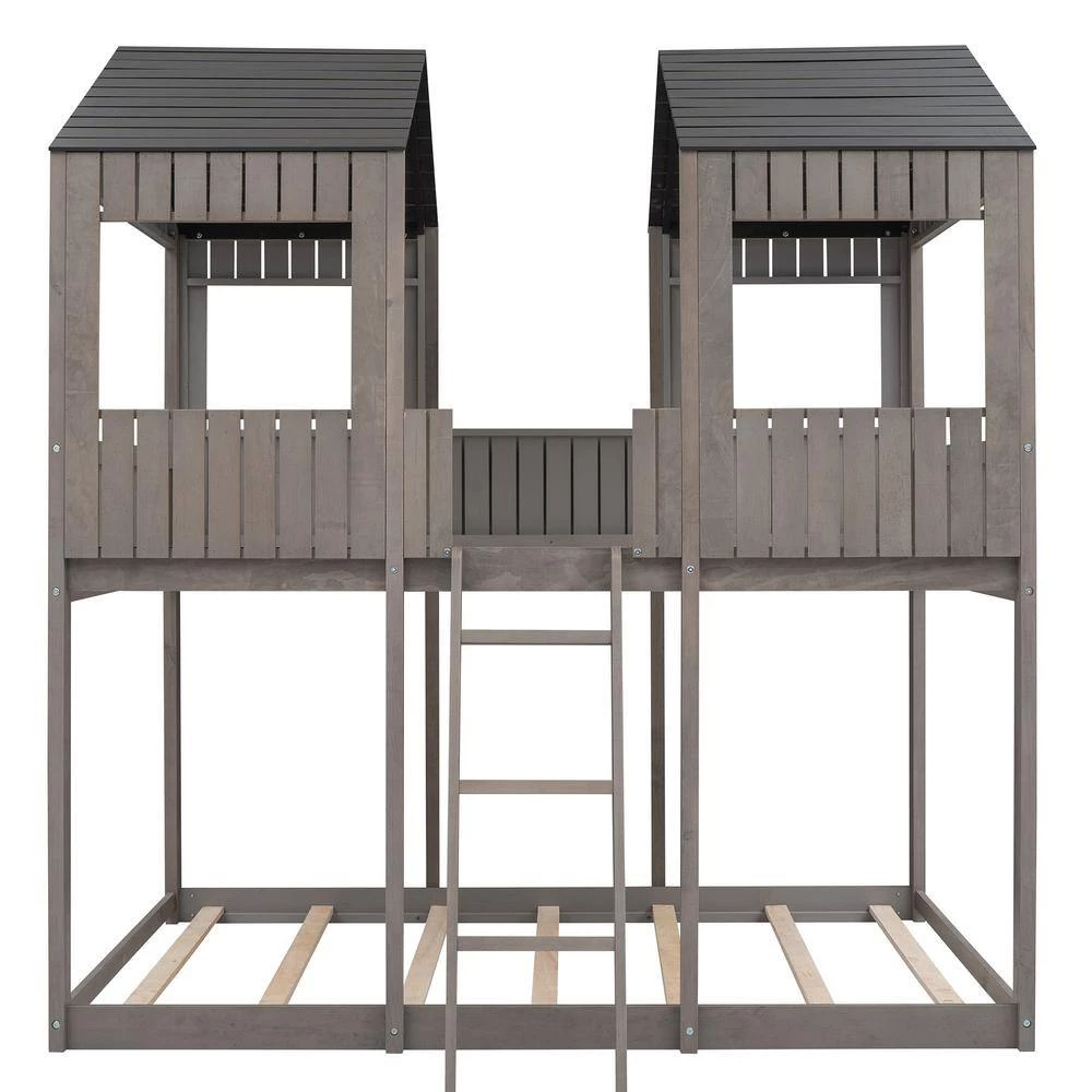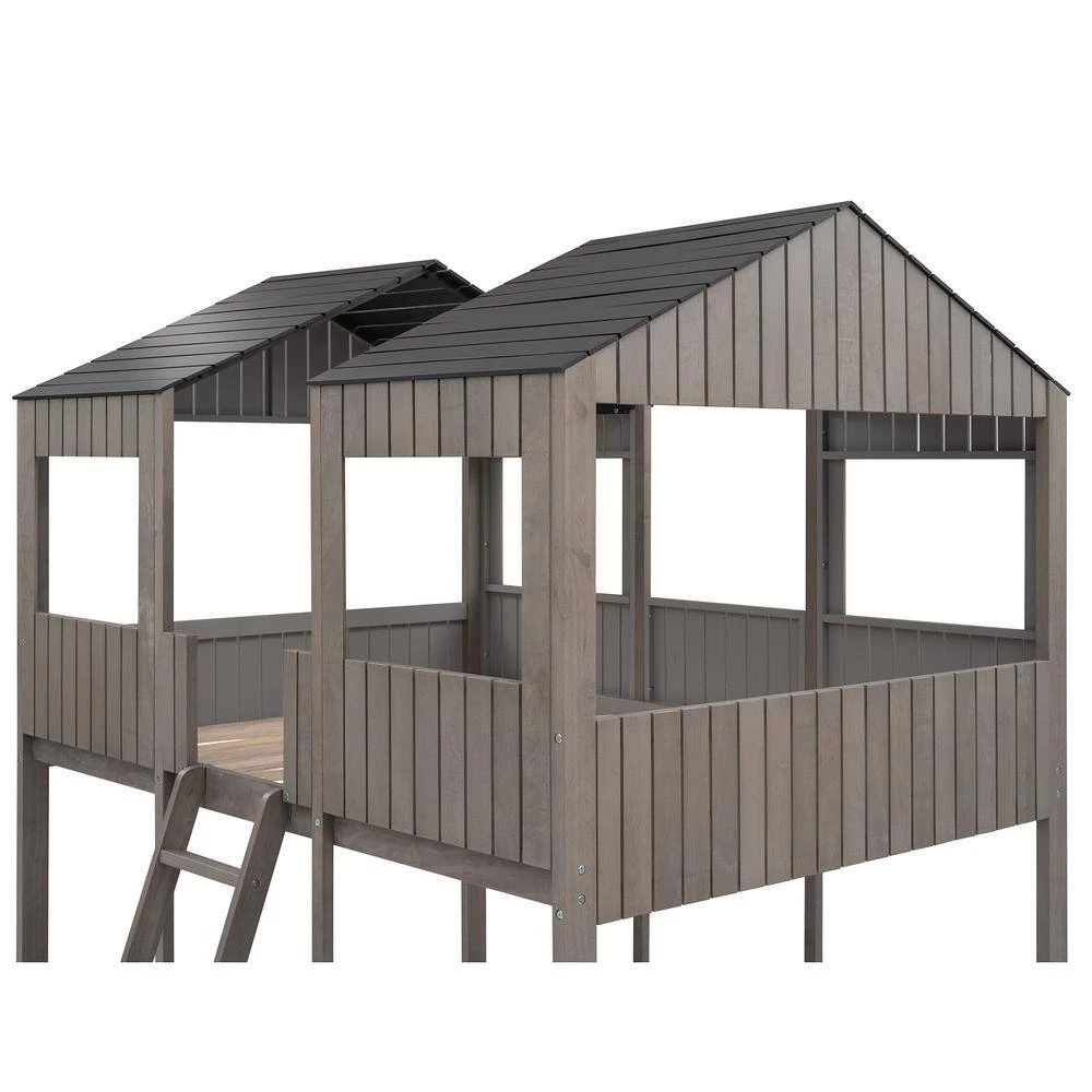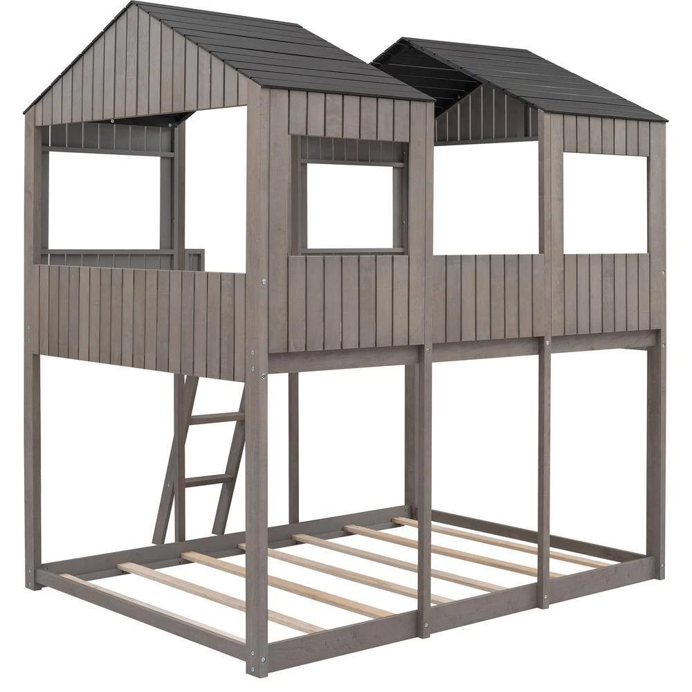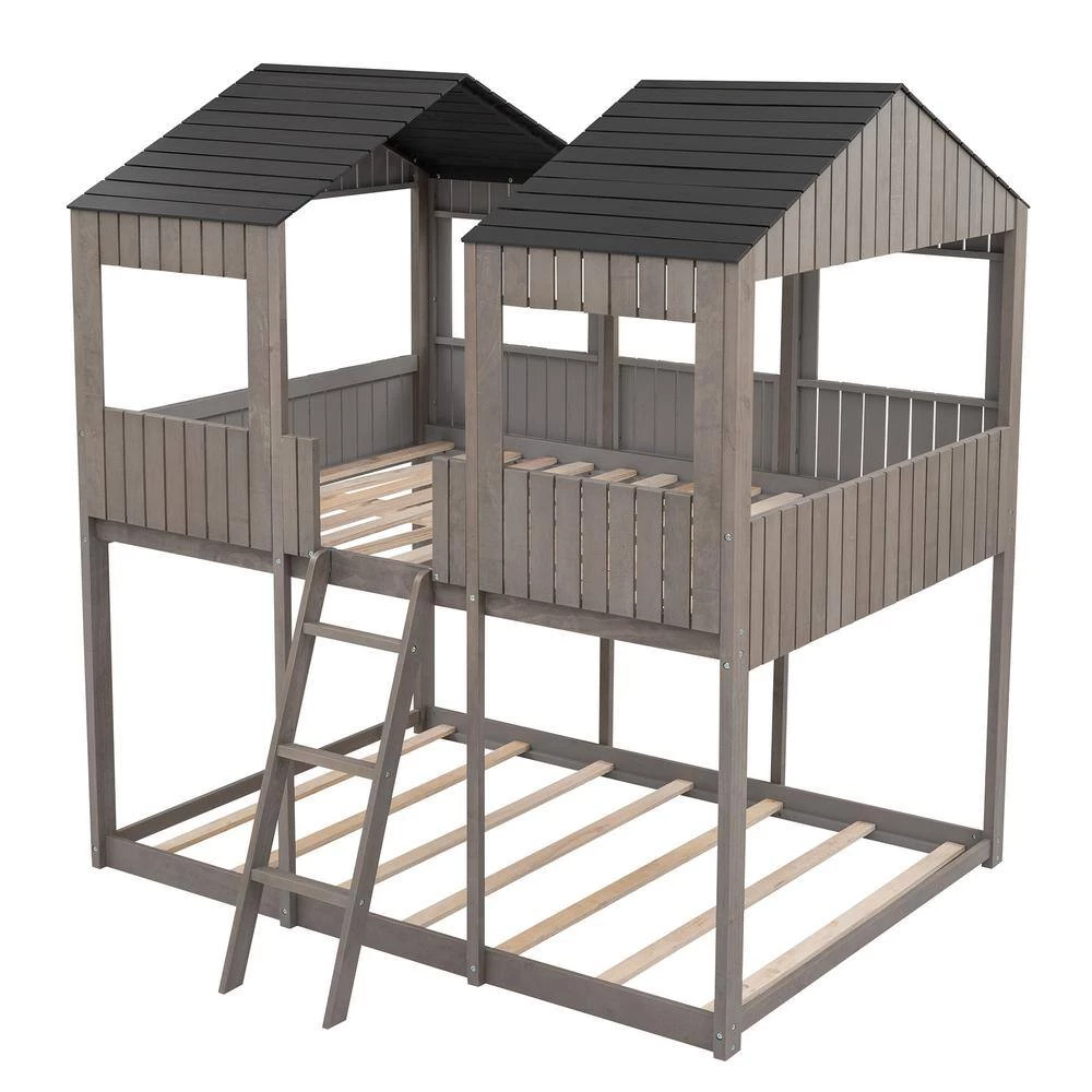- Featuring a pitched roof and wall section with window, this unique and intricately designed bunk bed creates a fun and adorable space that not only serves as a comfortable sleeping area but also double as a space for your kids to play and have fun.