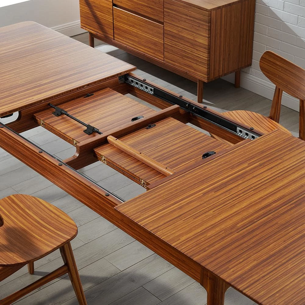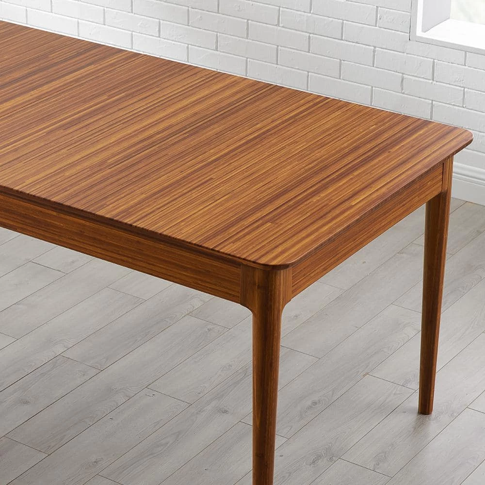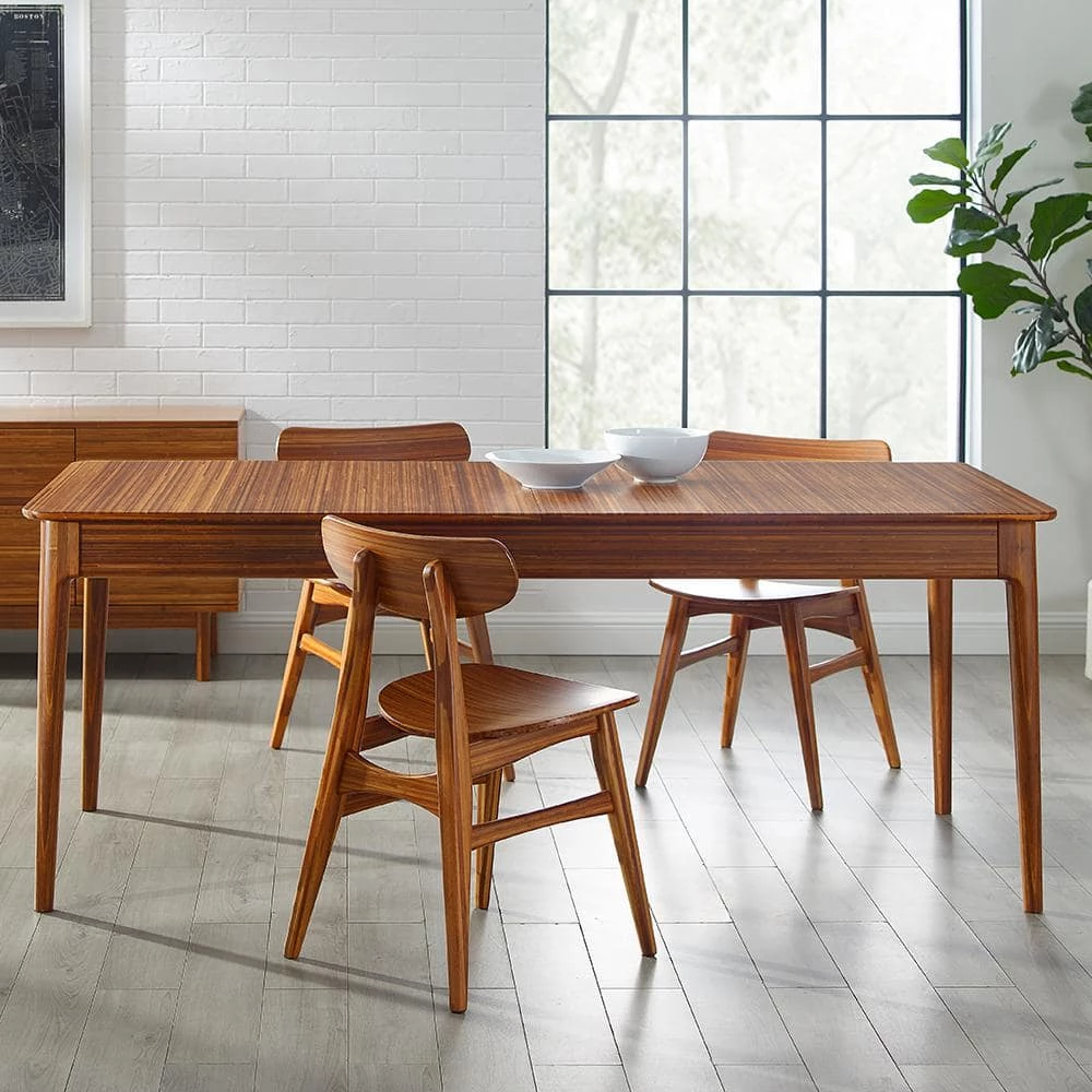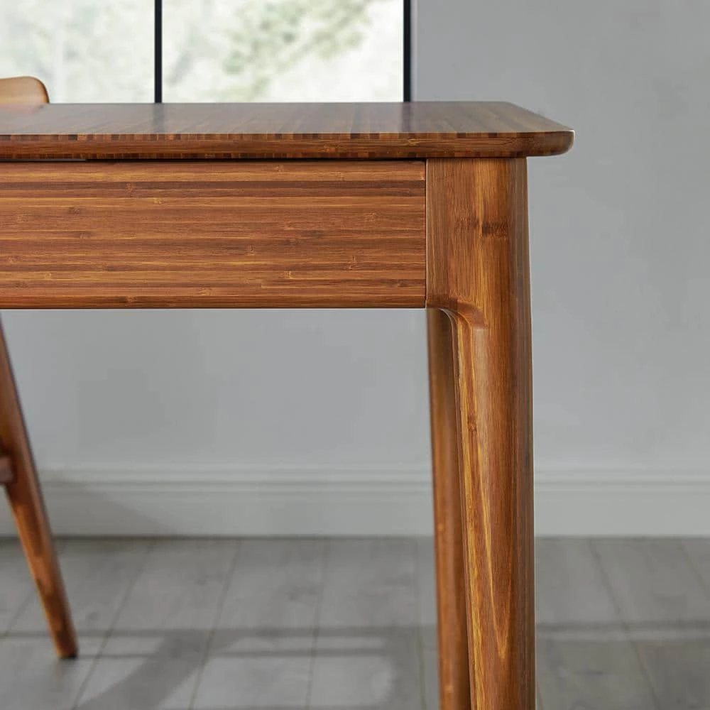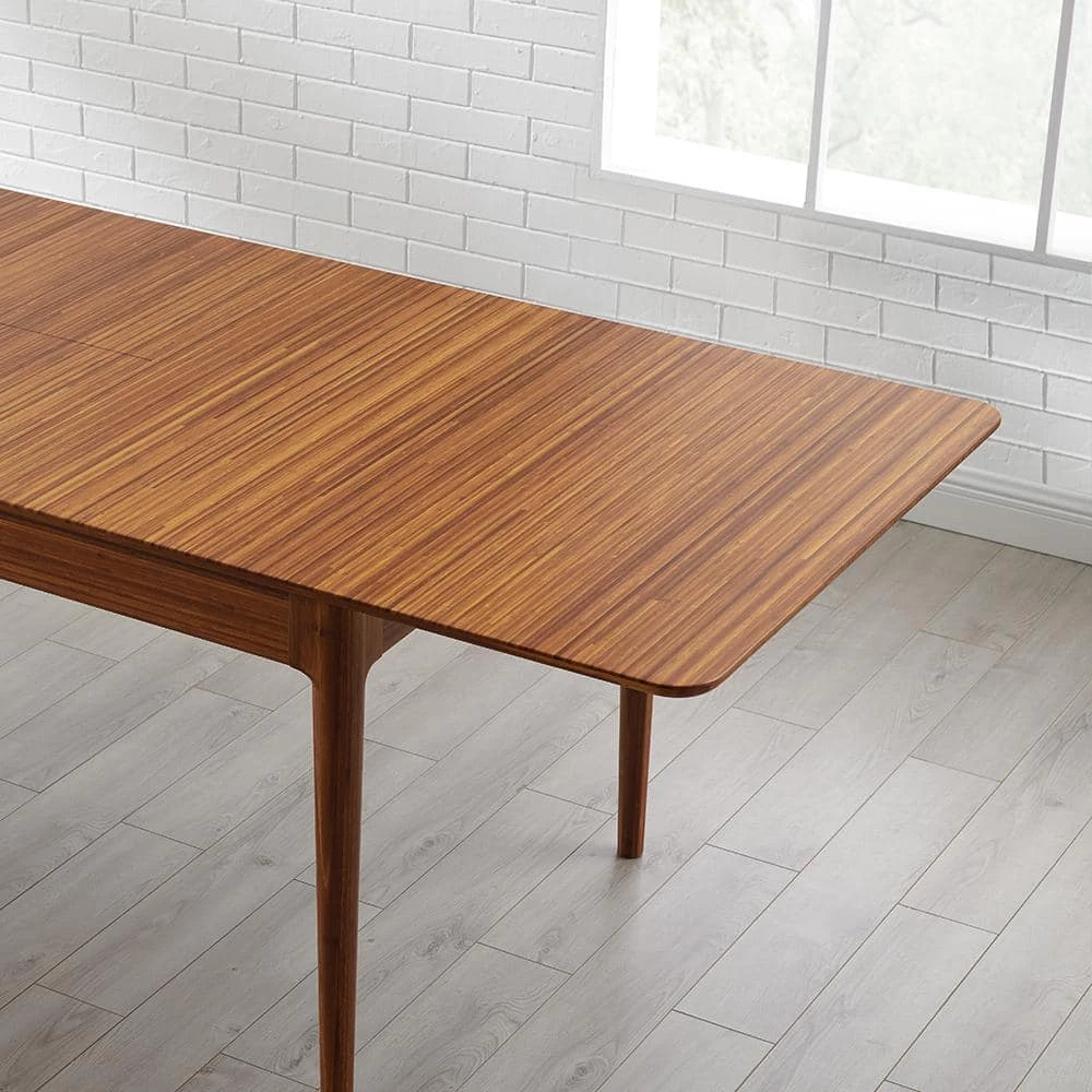 Perfect when space is a premium, the simple lines of the Erikka dining table bring the simple elegance of Mid-Century design into the modern home. The Erikka ‘s solid bamboo table top features rounded corners, bull-nosed edges which beautifully show off the color and grain of the bamboo material, and softly rounded legs, which elegantly taper towards the floor. After guests depart, the leaf easily folds up and stores neatly under the table top. Expertly crafted in earth friendly solid bamboo, and shown in classic amber finish. The Erikka dining table makes it easy for you to promote sustainability in a lovely, classic and functional way in your home.