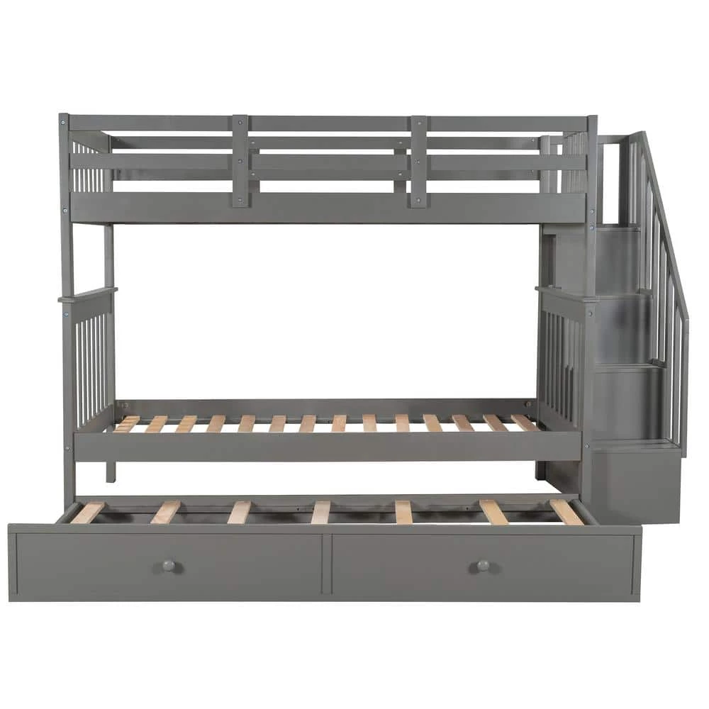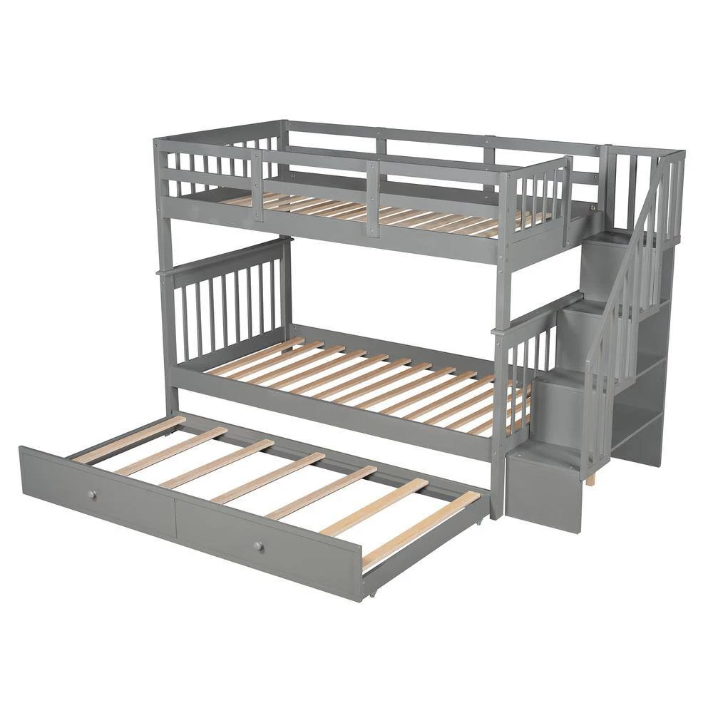 If you need extra sleeping space or your family love sleepovers, this stairway twin over twin Bunk bed withtrundle is perfect for your home. Open shelves located beneath the attached staircase provide ample storage for your toys and bedding. High-quality, solid pine legs and a strong, durable frame ensures stability and durability for long-term use, and can be separated into two twin size bed. Slat kit included so box springs are not required. This bunk bed is designed with a clean silhouette and a hue of elegance. It suits all styles of home decoration, and completes the look of any bedroom.