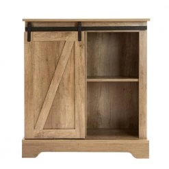 - A barn-style cabinet door can slide either side on a metal track, revealing an open and adjustable shelf for your tableware, storage bins, and other books.