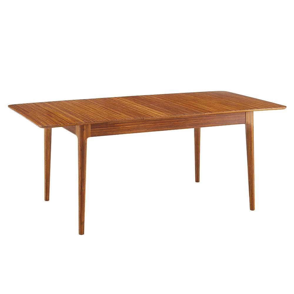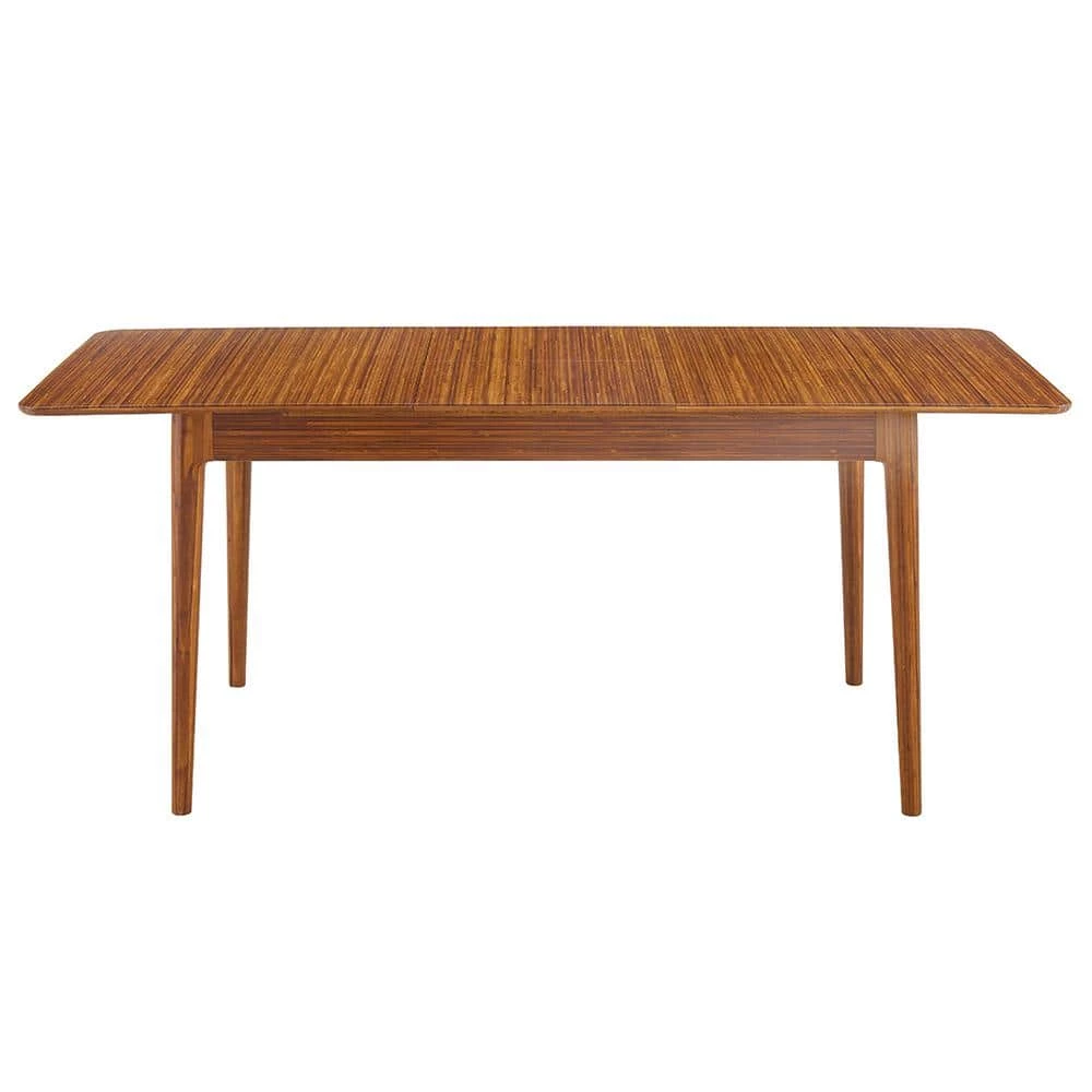 Perfect when space is a premium, the simple lines of the Mija dining table bring the simple elegance of Mid-Century design into the modern home. The Mija’s solid bamboo table top features rounded corners, bull-nosed edges which beautifully show off the color and grain of the bamboo material, and softly rounded legs, which elegantly taper towards the floor. Suitable for small spaces, and expandable to fit your extra guests, the smartly scaled 50 in. table extends to a full 68 in. with the addition of an 18 in. self-storing butterfly extension leaf. After guests depart, the leaf easily folds up and stores neatly under the table top. Expertly crafted in earth friendly solid bamboo, and shown in classic amber finish. The Mija dining table makes it easy for you to promote sustainability in a lovely, classic and functional way in your home.