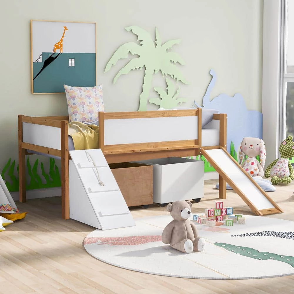 - This novel design loft bed is manufactured with solid pine frame to guarantee the stability and durability.
