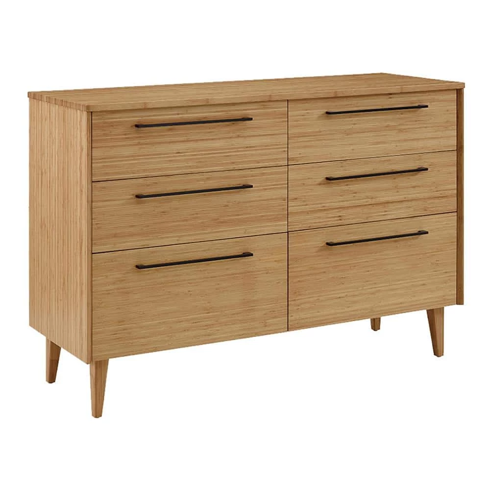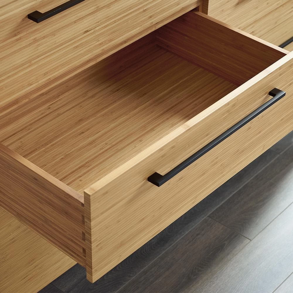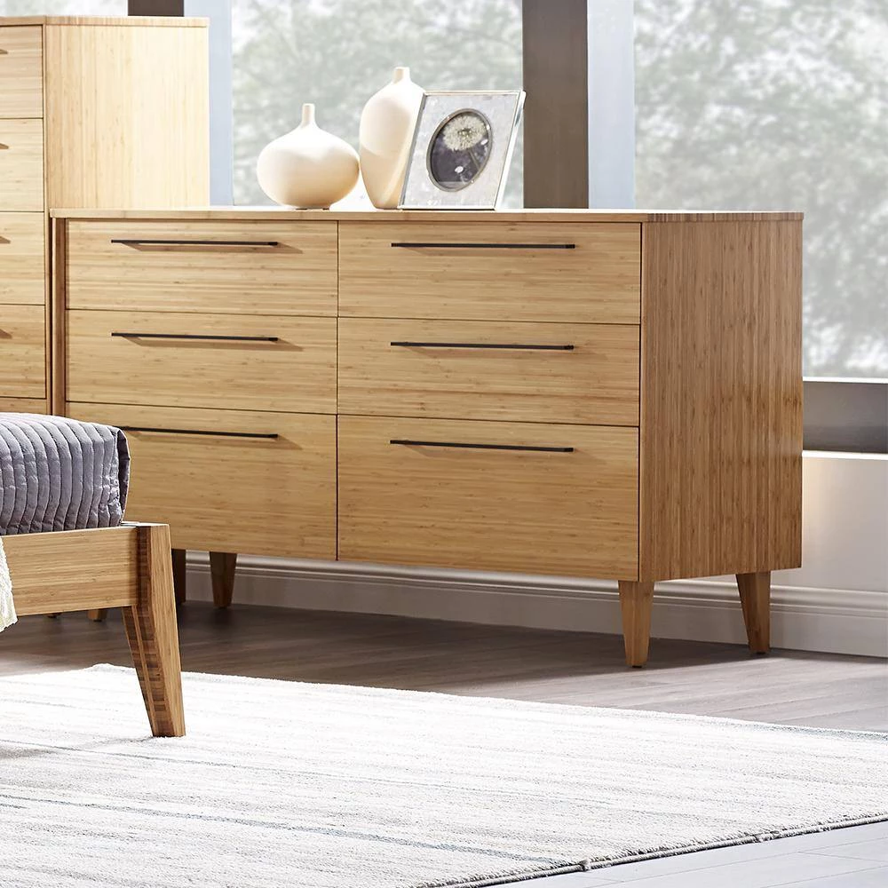Showcasing the beautiful color and grain of solid bamboo, the smartly scaled Sienna six drawer double dresser features contemporary styling, clean lines and beautifully beveled edges. The Sienna double dresser is beautifully finished on all four sides and features a 5-sided drawer box with English dovetail, sleek matte black stainless steel pulls, under mount drawer glides and soft closing drawers. Available in caramelized and rich Mocha finishes.