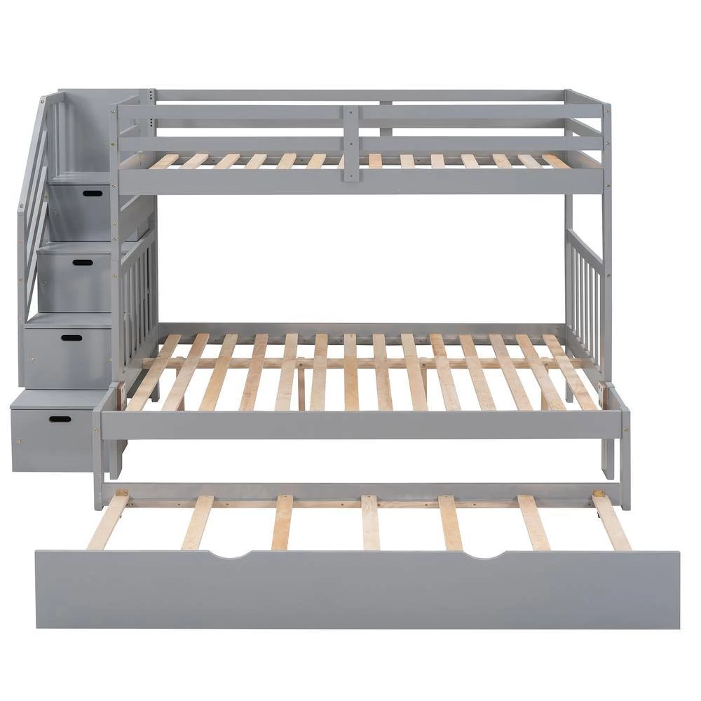 If you need extra sleeping space or your kids love sleepovers, this Stairway Twin-Over-Twin or Twin over Full Bunk Bed with Twin size Trundle and Drawer is perfect for your home. Three open shelves located beneath the attached staircase and four drawers provide ample storage for your little ones’ toys and bedding. High-quality, solid pine legs and a strong, durable frame ensures stability and durability for long-term use. Slat kit included so box springs are not required. This bunk bed is designed with a clean silhouette and a hue of elegance. It suits all styles of home decoration, and completes the look of any bedroom.